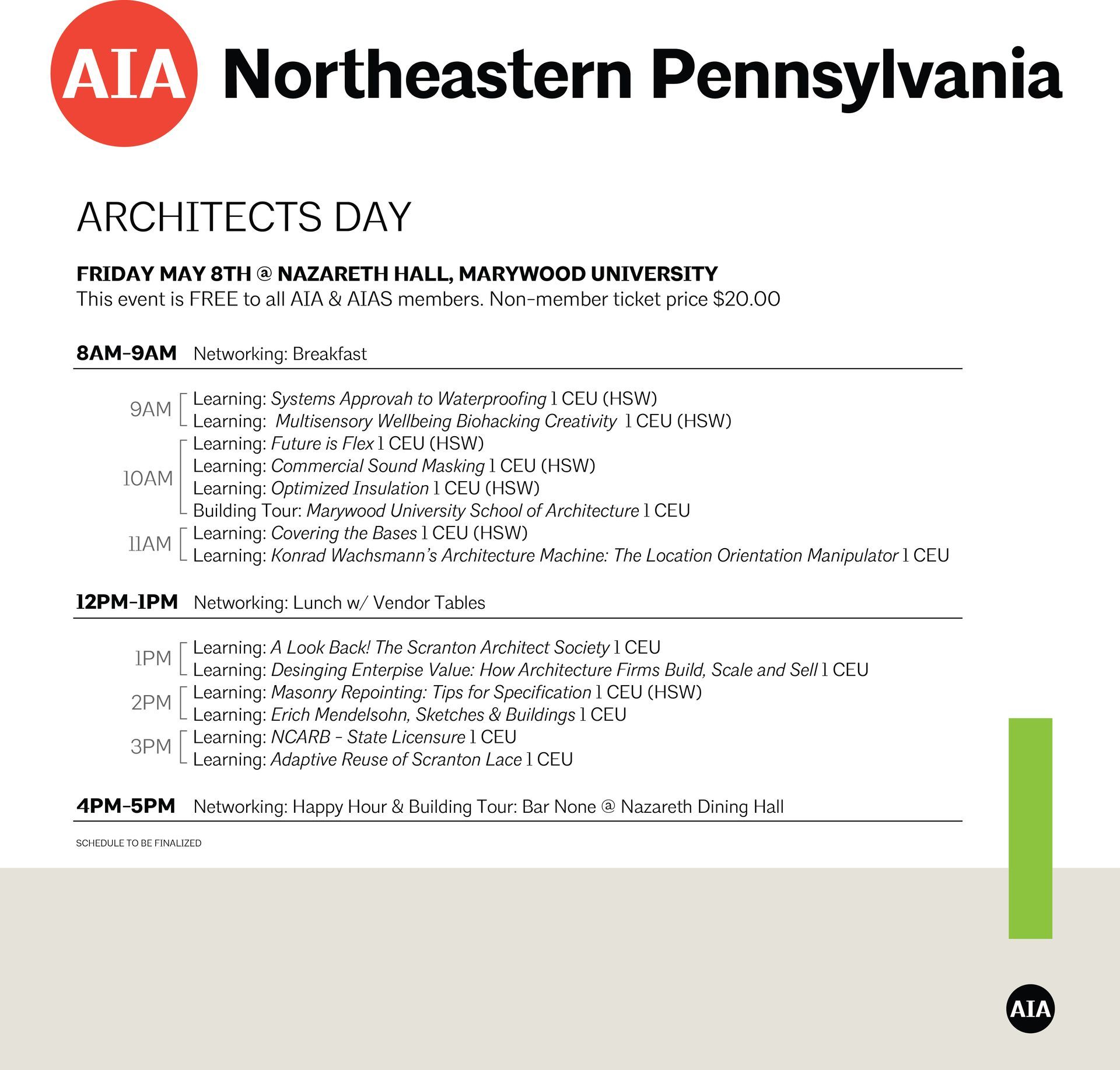 This event is FREE to all AIA & AIAS members. Non-member ticket price $20.00. AIA NEPA will be hosting an Architects Day to provide continuing education credits to our membership.